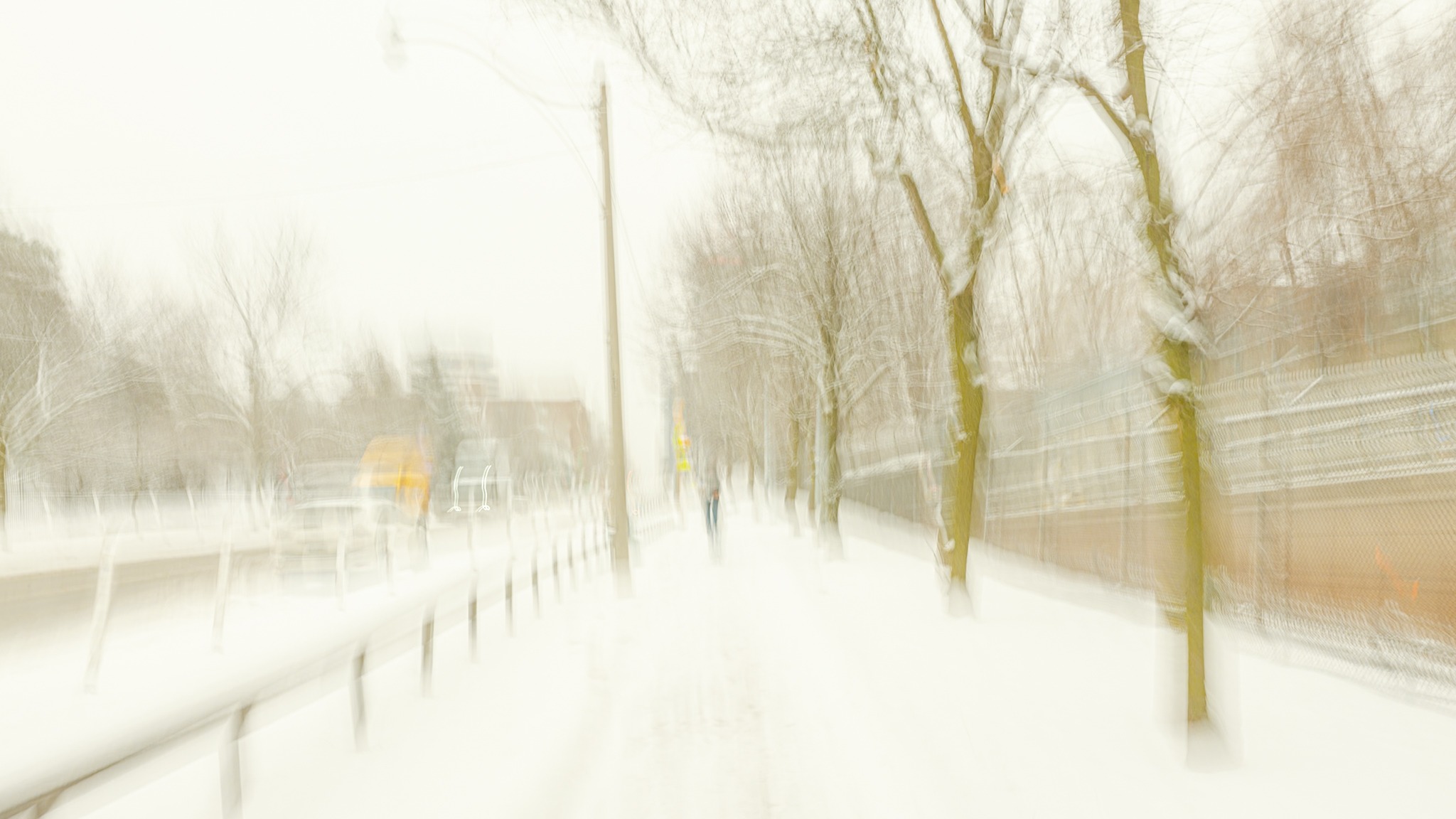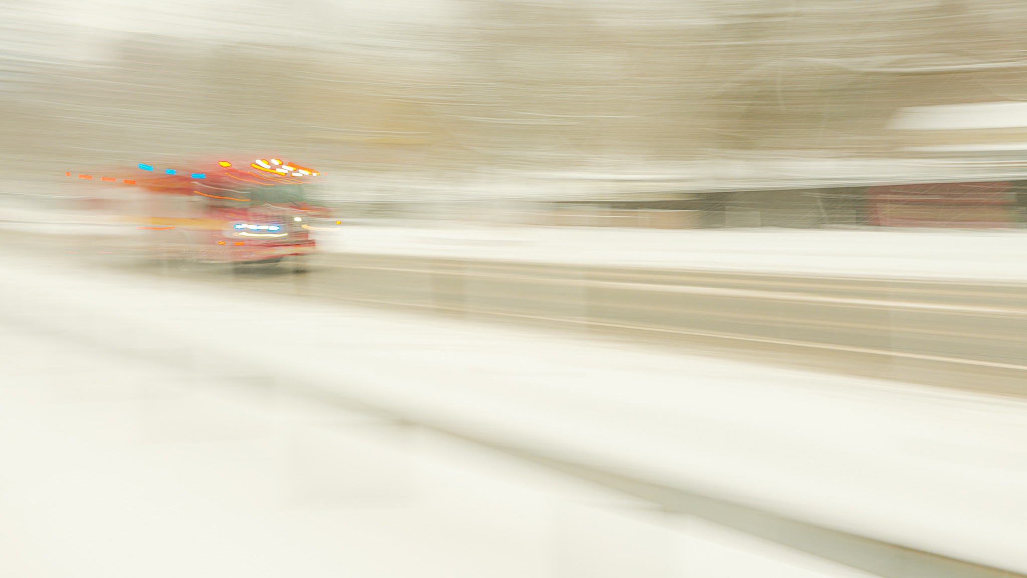 Snow absorbs the city; motion remains